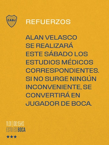 La cuenta Esto es Boca informó en las redes sociales sobre la inminente firma de contrato hoy pasadas las 12 de la noche: “Alan Velasco se realizará este sábado los estudios médicos correspondientes. Si no surge ningún inconveniente, se convertirá en jugador de Boca”. Esta mañana, el mediapunta de 22 años se sometió a los estudios de rutina y quedó listo para ser presentado la semana que viene junto a Ayrton Costa, que ayer hizo lo propio y ya se sumó a la pretemporada diagramada por Fernando Gago en el Predio que Boca tiene en Ezeiza. Velasco firmaría hasta fines de 2028.