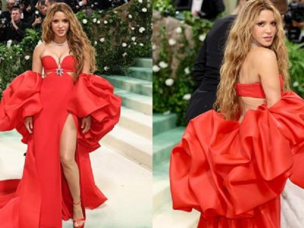Shakira se convirtió en la segunda colombiana en esta versión, que al igual que su compatriota Karol G le dijeron sí por primera vez a los llamados Óscar de la moda. Para esta ocasión, la intérprete de BZRP Shakira Music Sessions Vol. 53 eligió el color rojo en una tela vaporosa, con una enorme cola y con margas de gran tamaño con un delicado tocado de brillantes en el escote.