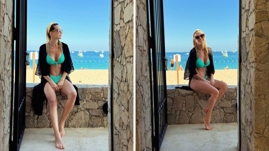 Sentada sobre un pequeño muro de piedra y con el mar de fondo, se lució con una bikini color turquesa, en tono aguamarina, muy al estilo veraniego. Se trata de un conjunto de corpiño triangular con breteles finos y bombacha cavada, con ambas piezas que tienen tiras que se anudan en forma de moño: en el frente en el caso de la parte superior y en los laterales de la parte de abajo.