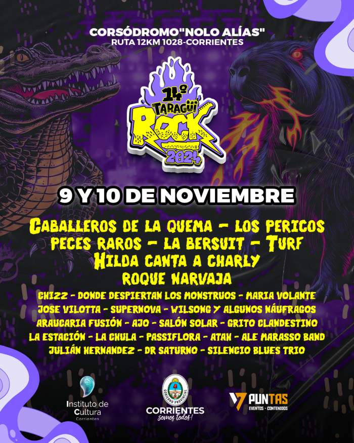 El Instituto de Cultura de Corrientes confirmó ayer las primeras bandas que formarán parte del esperado Taragüí Rock 2024, a realizarse los días 9 y 10 de noviembre en el Corsódromo Nolo Alías. Entre los nombres destacados están Los Caballeros de la Quema, La Bersuit, Los Pericos y Turf, en lo que promete ser una edición cargada de clásicos del rock nacional.